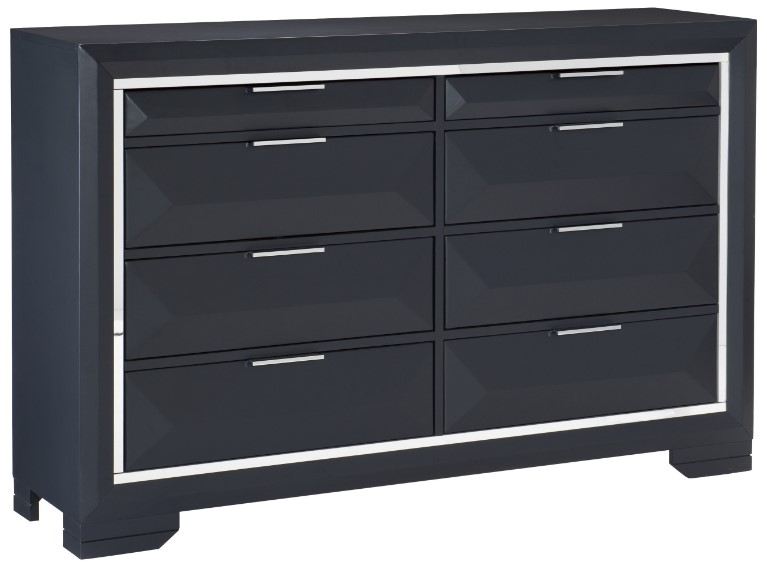 The modern design of the Rosemont collection creates a striking profile for your bedroom. The midnight blue finish is reflected by the chrome banding that defines the front of the dresser. Chrome pull hardware accents each of the raised drawer fronts.Read More