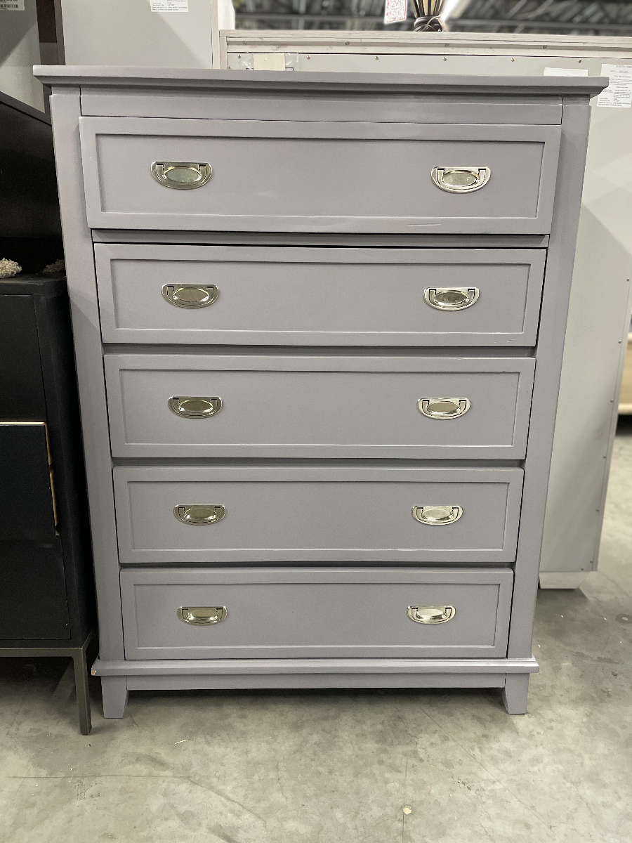 *As is item* Item has been returned and has been repainted. Add stylish and efficient storage to your bedroom with this gray 5-drawer chest. Crafted from wood with a sleek gray finish, this chest features five dovetail drawers with smooth ball-bearing glides for easy access to your clothing and belongings.Read More