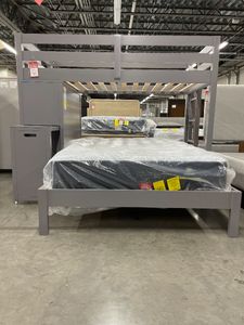 *As is item* Item has been returned and has some indents and has been repainted. Mattress not included but available for purchase. Maximize your child's bedroom space with this multifunctional gray loft bunk bed, designed for both style and practicality. Crafted from wood with a sleek gray finish, this bunk bed features a top twin bunk with guard rails for safety and a full-size lower bed.Read More