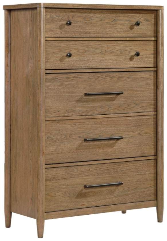 It features five smoothly operating dovetail drawers with full-extension ball-bearing glides, providing ample space for all your clothing and accessories. The bottom drawer is lined with cedar veneer, offering natural protection for delicate items. Adorned with sophisticated flat black-tone knobs and antique nickel-tone bar pulls, this chest arrives fully assembled, ready to seamlessly enhance your bedroom decor.