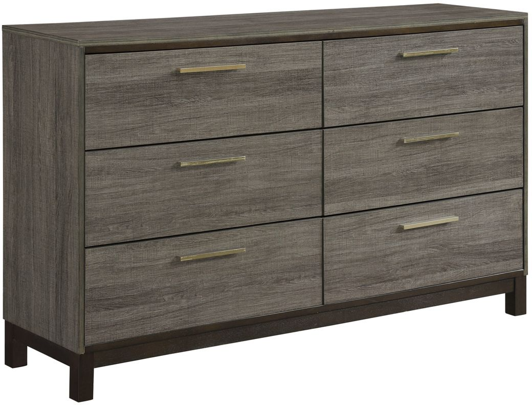 The contemporary styling of the Vestavia collection provides a unique platform from which to redecorate your bedroom. Faux wood printed veneer provides subtle texture and a gray finish perfectly contrast the dark brown base rail of the dresser. Clean lines lend to the angular modern look and are enhanced by the antique brass tone bar pulls.Read More