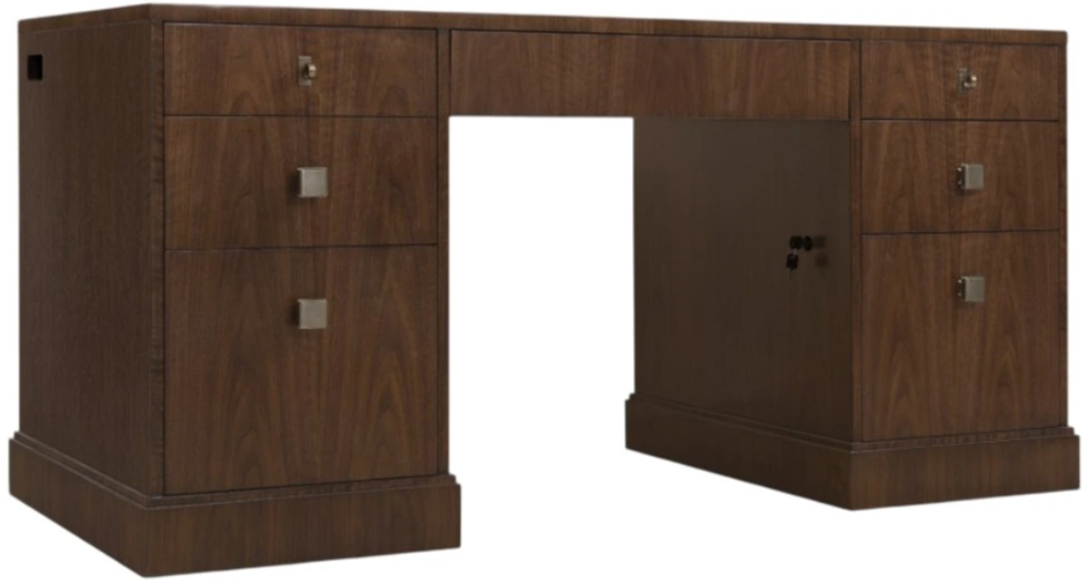Command your workspace with the Archives executive desk, designed for structured elegance. Crafted with figured walnut veneers, it includes seven versatile drawers, integrated file storage, and smart wire management. The satin brass hardware and rich walnut finish speak to a "historic" aesthetic.Read More