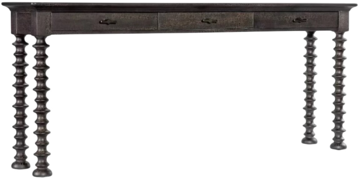 Finish: Charred Timber: inspired by the restorative beauty of a fire-ravaged forest. Distressing includes worm holes, rasping, gauging, plane shock, hand plane, drawknife, wire brush and screw head. Dark brushed bronze metal bar pull.
