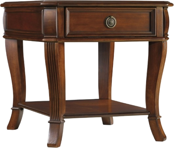 In a classic casual silhouette with a rich cherry finish with distressing and antiquing and a decorative veneer top, the Brookhaven End Table features one drawer and one shelf and refined details like a brass-finished medallion drawer pull and curved, fluted legs.Read More