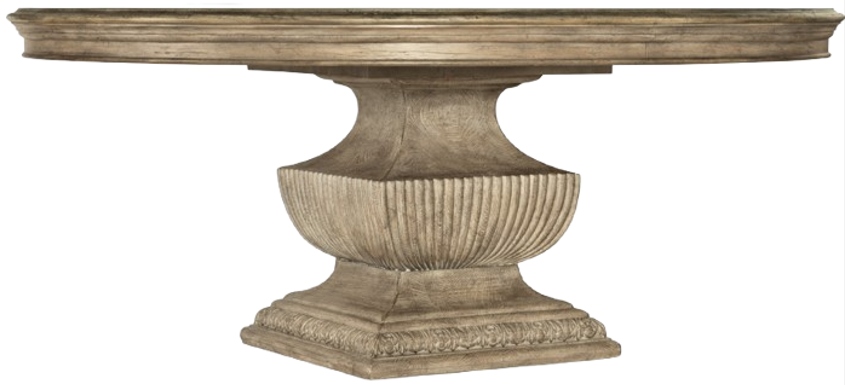 The classical urn-shaped base anchors the piece in old world charm, while the Antique Slate finish with a beautiful patina updates it for today’s relaxed styles. Will seat up to six guests. Commanding attention in any space, the impressive scaling of the Castella Collection combines with classic design elements including scrolls, serpentine shapes, rope twist molding, acanthus leaf details and fleur-de-lis accents to create old world charm. Infused with emotion, the collectionÕs exuberant scale and timeless motifs define its casually opulent style. Presented in an updated mid-tone brown finish with a beautiful patina, Castella offers Classic European design with an updated twist.
