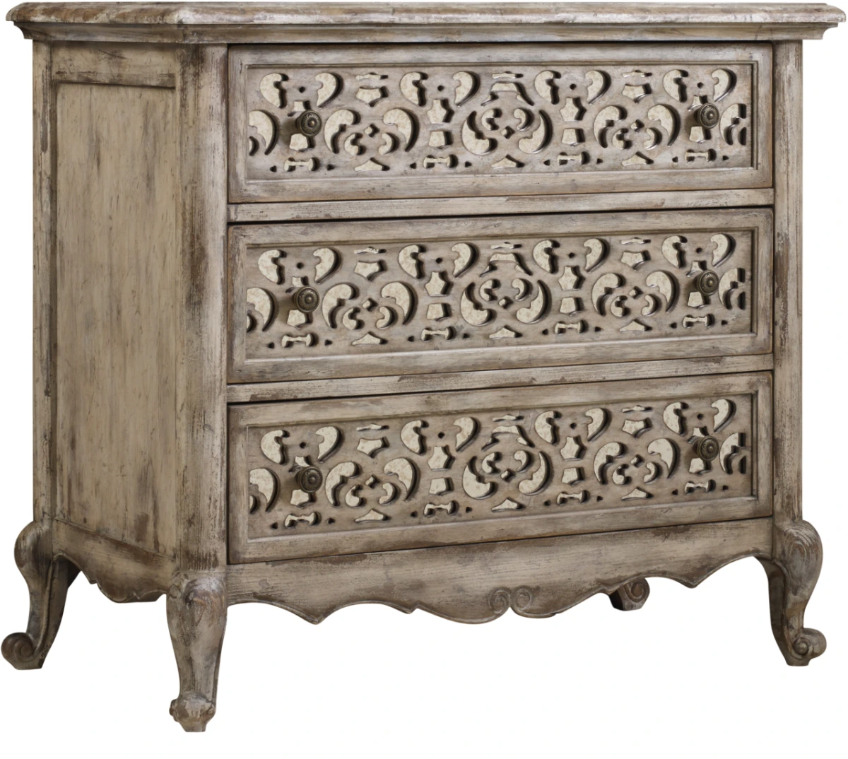 Create a bedroom retreat of unsurpassed romance with the Chatelet fretwork nightstand with its exquisite vintage white finish with intricate fretwork over antique mirror and generously scaled, burnished bronze drawer pulls inspired by antiques.Read More