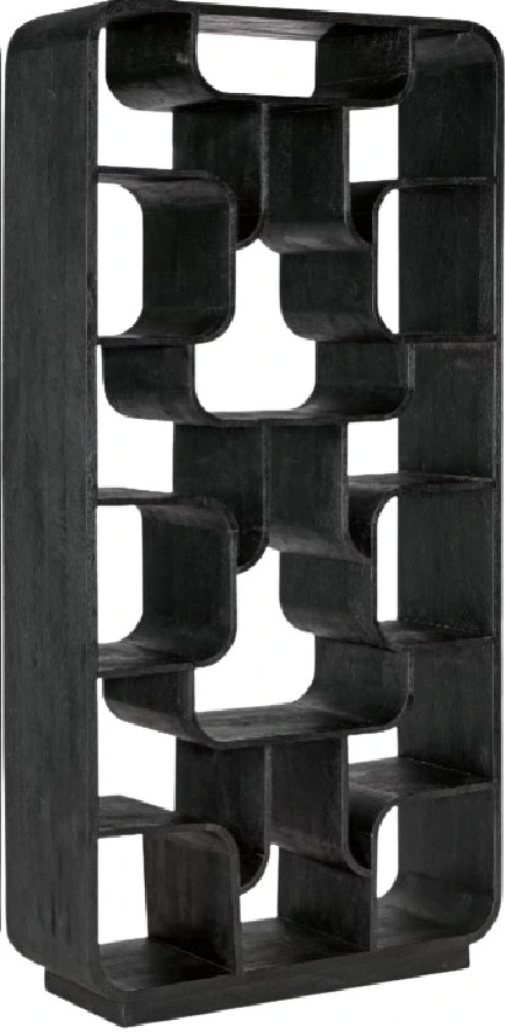 Make a bold vertical statement with the Sloane etagere with curved edges, sixteen open spaces, and a black finish on mango wood, it's ideal for showcasing books and decorative objects in a curated home office or living room.Read More