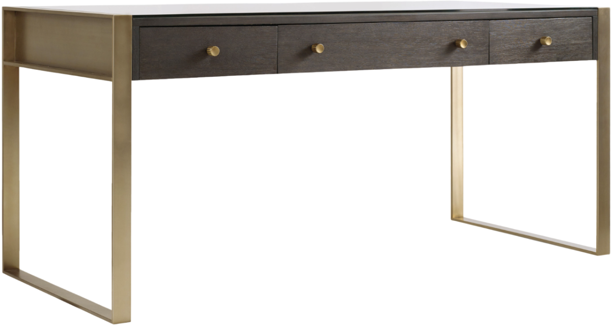 Bringing together the rich midnight finish and soft brushed brass legs, the Curata writing desk offers three drawers, including a center drop-front drawer for keyboard use and two utility drawers. A glass-top inset gives a smooth writing surface.Read More