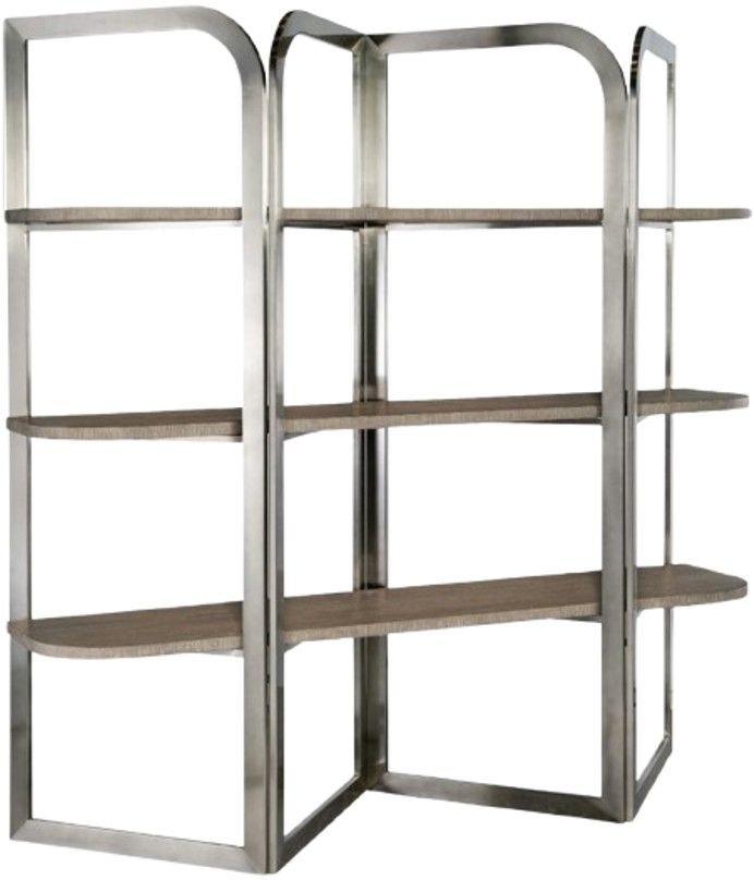 Architectural and artistic with a luxe mixture of materials, the Modern Mood etagere has three fixed shelves crafted of wire-brushed quartered oak in the mink finish with dark, earthy brown hues with notes of black. The shelves are surrounded by a shaped brushed metal frame in a warm pewter-colored finish.Read More