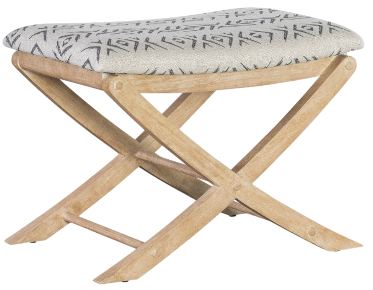 Tropical meets tribal with this Retreat camp stool bed bench. Featuring a seat upholstered in the patterned jafar grey, it has an x-base design. The base and stretcher are crafted of wood finished in the sand-colored dune, transparent by design to showcase the unique grain patterns of the wood veneer.Read More