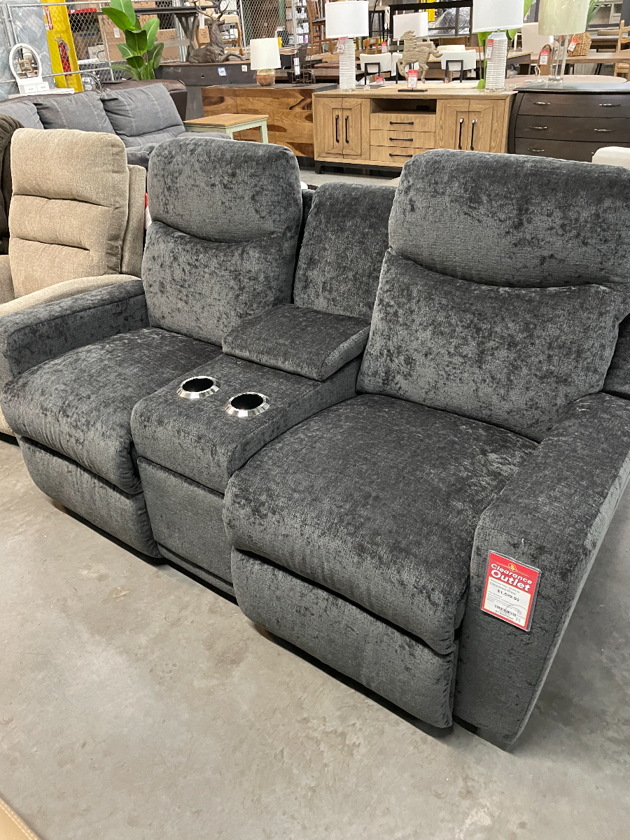 *As is item* Item was used as a previous floor model. The La-Z-Boy® Emmons Storm Power Reclining Loveseat with Console and Headrest combines design with ultimate comfort. Upholstered in sleek storm-gray fabric, it features power reclining seats, adjustable headrests, and a center console with storage and cupholders. Its style and functionality make it ideal for any living space.Read More