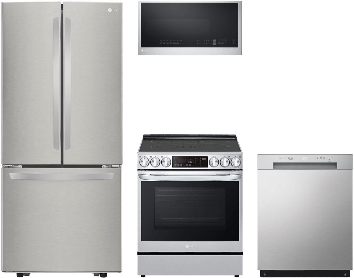 LG 4 Piece Stainless Steel Kitchen Package with French door refrigerator, slide in electric range, built in dishwasher, and over the range microwave.Read More