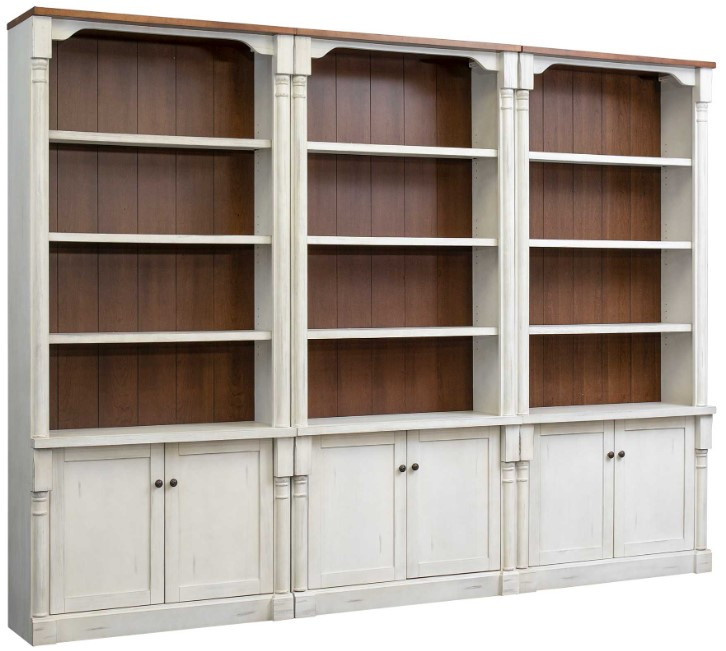 Three Stately 94″ Bookcases with its weathered wire brushed chalk finish, rustic knotty cherry finished tops and antiqued finished hardware