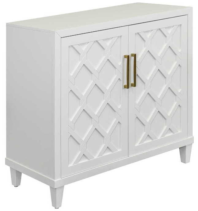 Fresh white finish and raised pattern on the doors resembling an intricate garden trellis, accented with brushed gold handles.