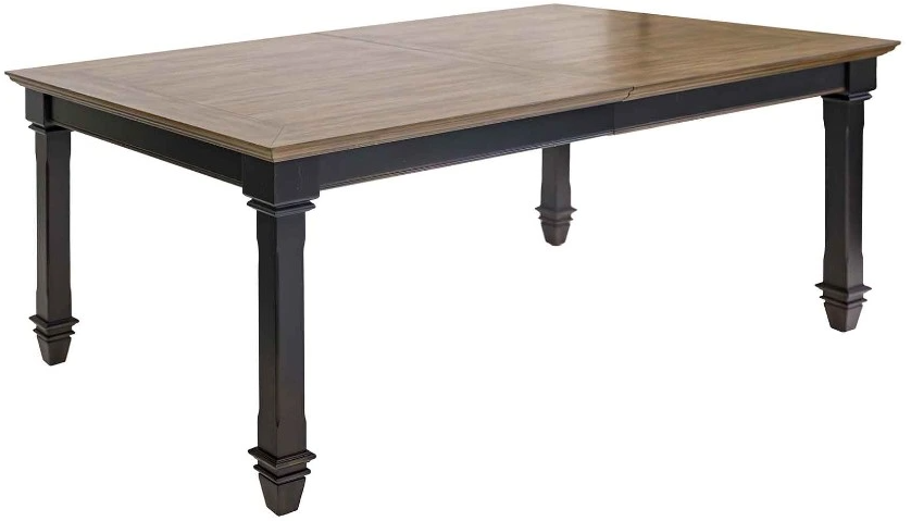 Two tone black finish with wood plank table top enhances the classic style