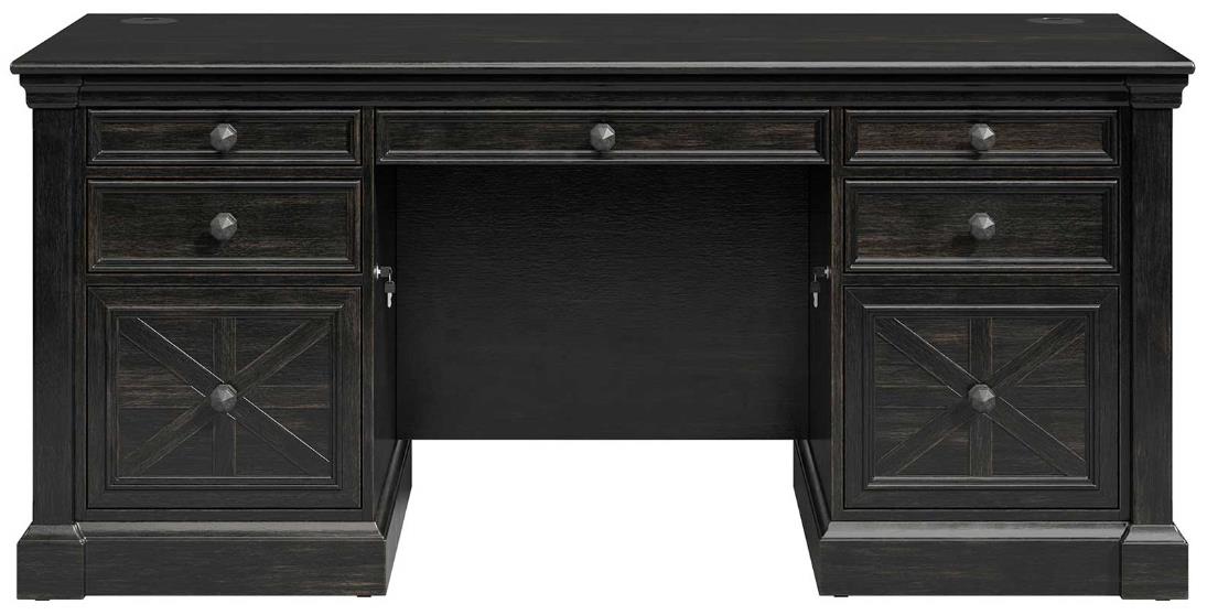 Kingston emanates an air of the English country manor. Dark chocolate rub-through finish is softly worn to enhance the wood and give a naturally aged look to the collection. Criss-cross detail adds interest and dimension to drawer fronts and panels, while mottled antique hardware enhances the look of the group.Read More