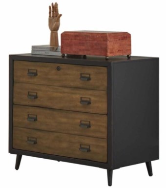 Reminiscent of old libraries and 20th-century newsrooms, Payton blends midcentury modern elements with subtly worn details, resulting in a comfortable, stylish collection with timeless appeal. Payton features natural wood fronts with matte black framing that is lightly distressed for a casual finish. Angled iron legs and label frame drawer pulls add authenticity to the design.