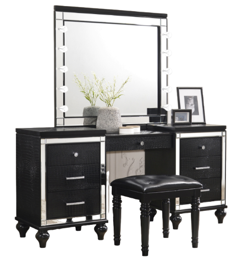 The Valentino 3-Piece Vanity Table Set combines sophistication and functionality. Featuring a sleek black vanity table with multiple storage drawers, a matching mirror, and a cushioned stool, this set offers a stylish and practical solution for your grooming and beauty needs.Read More