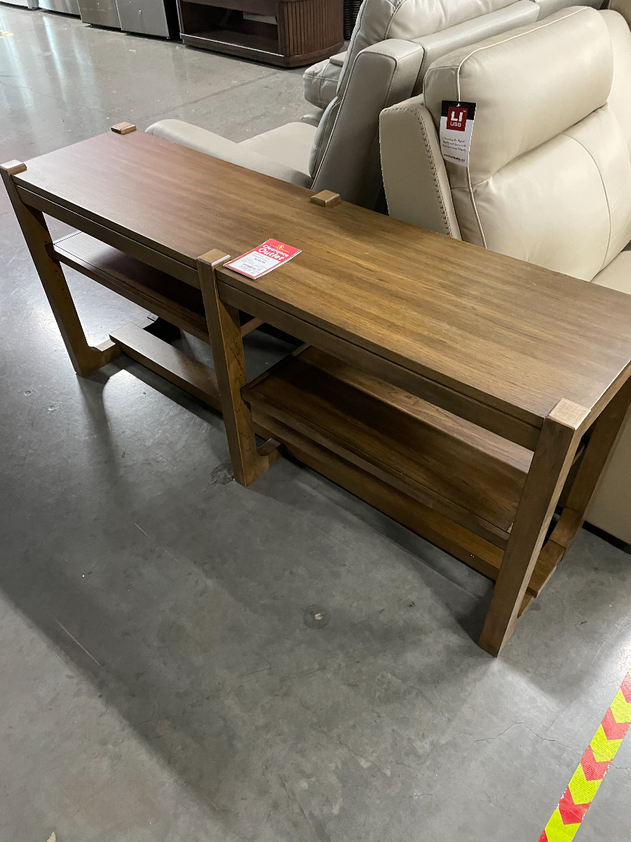*As is item* Item is unused, however item is chipped. This sofa table sits comfortably at the intersection of modern lodge and farmhouse aesthetics. Your warm and welcoming disposition is reflected in the charming architectural elements and light brown glazed finish. Even with its poise, this table remains practical.Read More