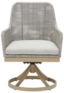 This swivel dining chair invites your casual contemporary style outdoors. With its resin wicker in a chic neutral hue, it expertly marries refined design with durability. Its 360-degree swivel makes it easy to switch from watching the kids at the pool to grabbing a drink from the table.Read More