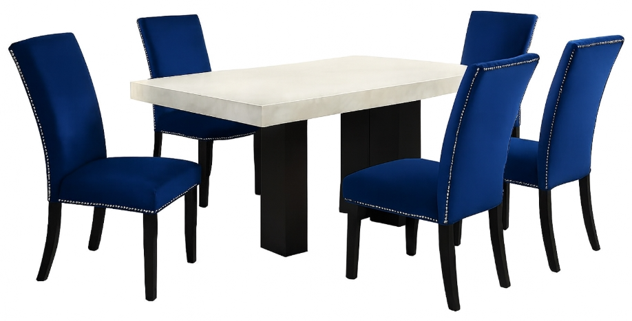 Elegant dining with a modern twist, Camila offers beautiful white marble with a choice of three chair options – silver or black leatherette or an upscale blue velvet look. All chairs feature nailhead trim to dress up any dining area. The dining collection is available in rectangular or square marble dining tops.Read More
