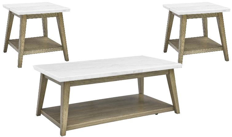 Scandinavian styling meets mid-century modern design in this clean, simple yet elegant set of tables. A beautiful white marble top with knife edge immediately grabs your attention as it sparkles in the light. Canted legs and a bottom shelf add look and function to this table set of cocktail and 2 end tables.Read More