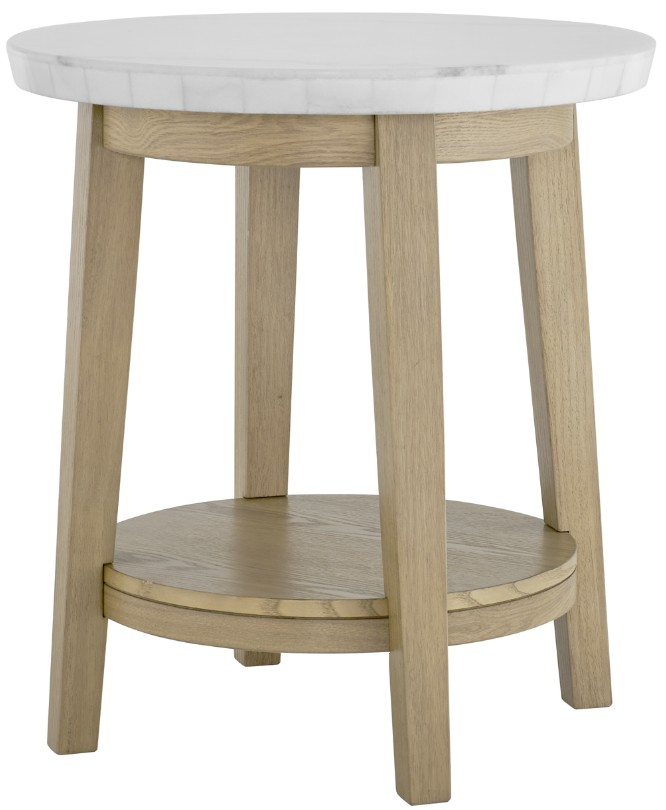The Vida 22" round white marble top end table blends Scandinavian and mid-century modern design in a compact, versatile form. Perfect as a side table or placed between upholstery pieces, its light burnished blonde finish and handy bottom shelf offer both beauty and functionality, providing space for storage or display.Read More